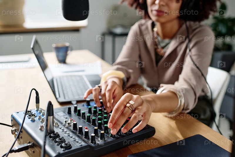 Сосредоточьтесь на руке молодой женщины, поворачивающей консоли звуковой доски