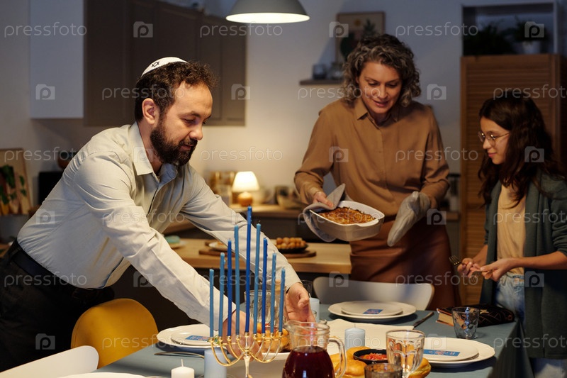 Бородатый мужчина с киппой на голове кладет тарелку с домашними закусками на стол