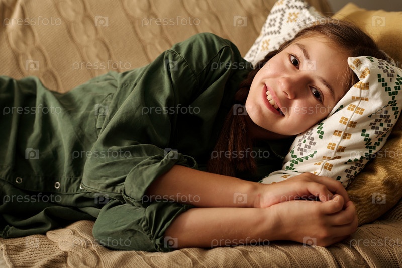 Счастливая милая девочка-подросток в повседневной одежде смотрит на камеру, отдыхая на диване