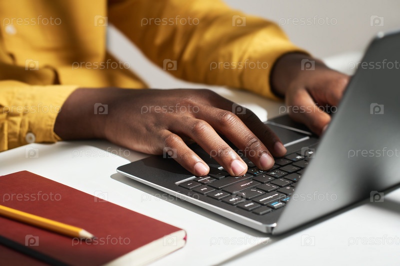 Руки молодого мужского солопреньюра, нажимающего кнопки клавиатуры ноутбука