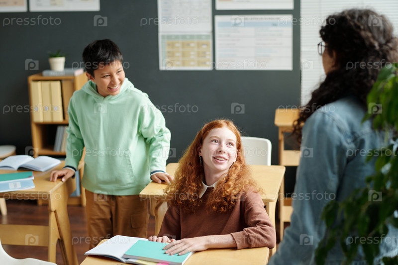 Милая веселая девушка смотрит на одноклассницу во время обсуждения чего-то смешного