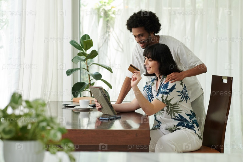 Счастливый молодой человек и его девушка с кредитной картой выбирают товары онлайн
