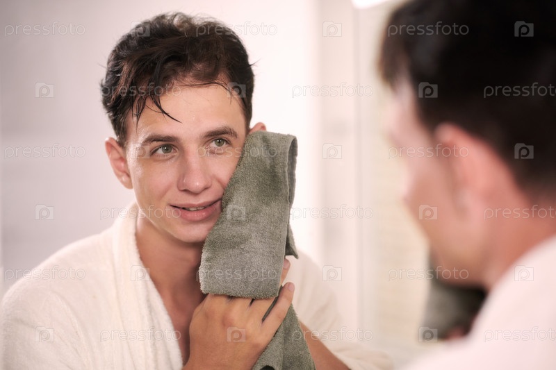 Молодой улыбающийся мужчина в белом мягком халате высушивает лицо полотенцем после мытья