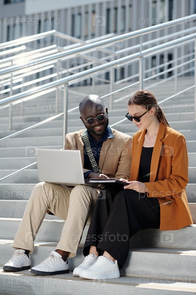 Уверенный афроамериканский сотрудник-мужчина объясняет данные коллеге