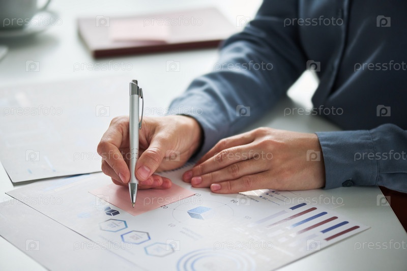 Руки молодой женщины-экономиста в синей рубашке, делающей заметки на бумаге