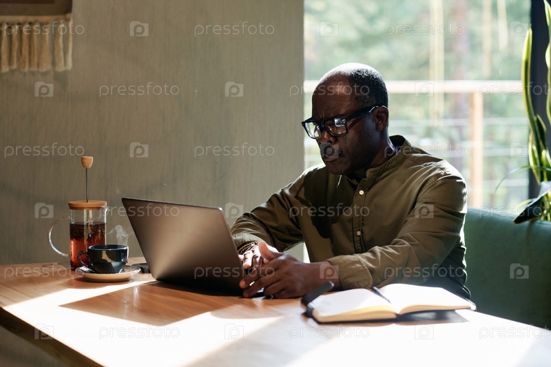 Старший мужчина работает онлайн на ноутбуке в кафе