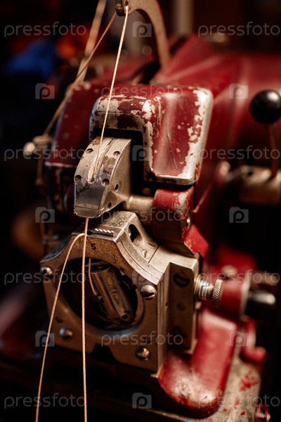 Часть красной металлической электрической швейной машины с толстыми белыми нитями