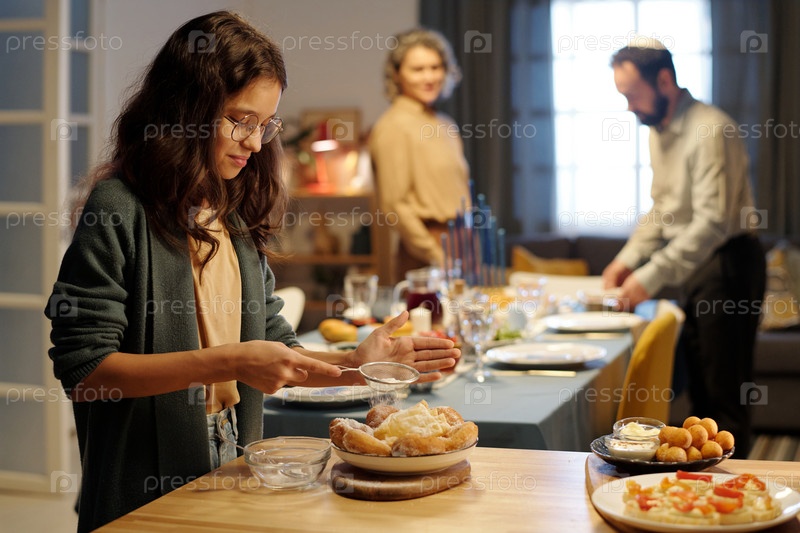 Милая девушка просеивает сахарный порошок через сито на вершине домашнего кугеля