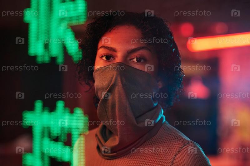 Красивая девушка с маской стоит в кафе со зелёными иероглифами, означающими лучшие рамены