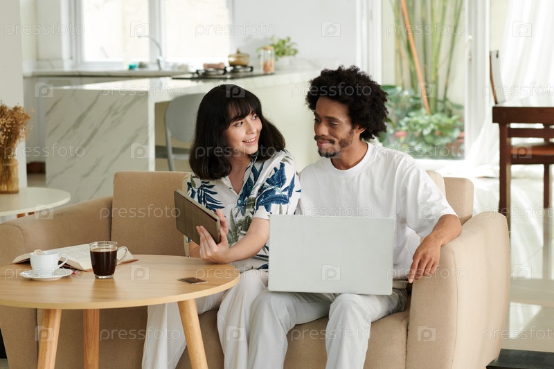 Молодая женщина с планшетом показывает мужу онлайн-товары на экране