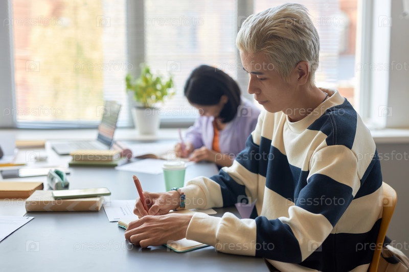 Боковой вид молодого студента-мужчины в полосатом пуловере, делающего заметки в копийке