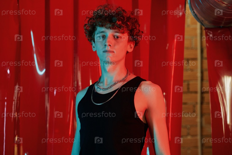 Серьезный парень с карими кудрявыми волосами стоит перед камерой