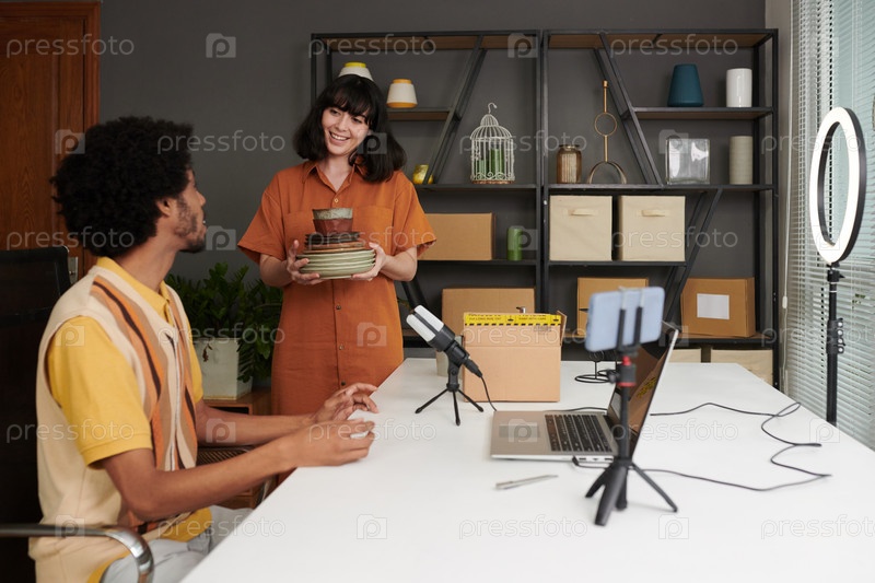 Счастливая молодая женщина с кучей глиняных изделий смотрит на своего мужа