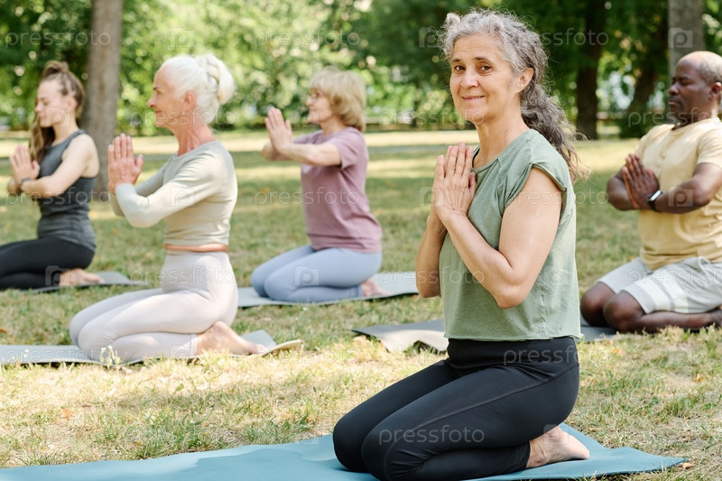Пожилая женщина медитирует на уроке йоги