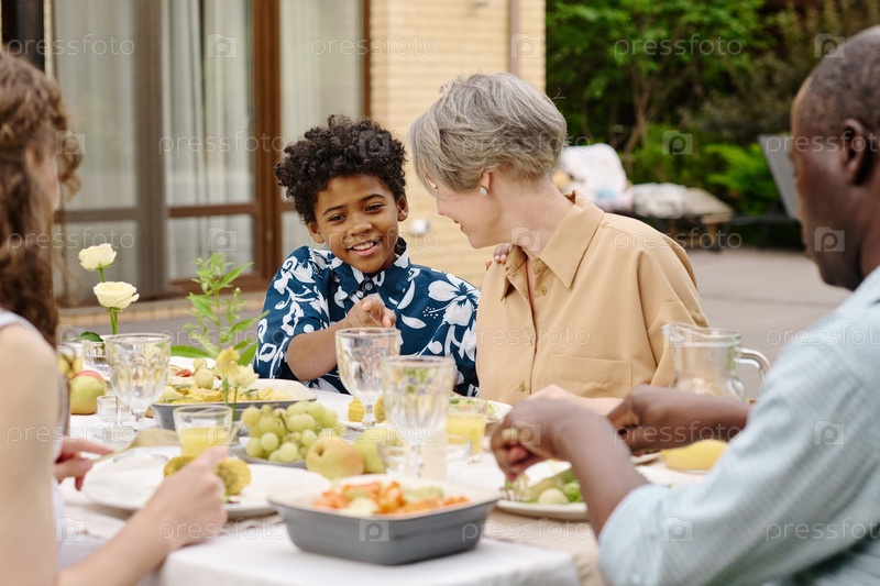 Милый улыбающийся мальчик указывает на пустой стакан во время разговора со своей бабушкой