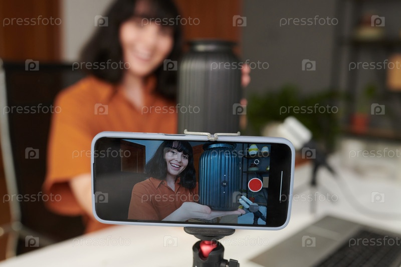 Счастливая молодая женщина с черной ручной вазой на экране смартфона