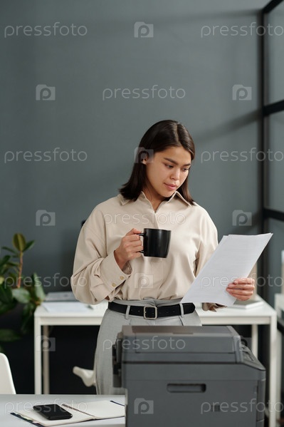 Молодая брюнетка в тихом роскошном наряде, выпивая чашку кофе в офисе
