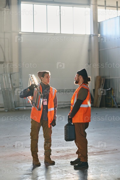 Два инженера-мужчины в отражающих жилетах обсуждают что-то на рабочей встрече