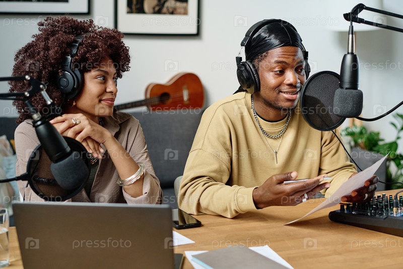 Молодой афроамериканский мужской радиоведущий разговаривает в микрофоне
