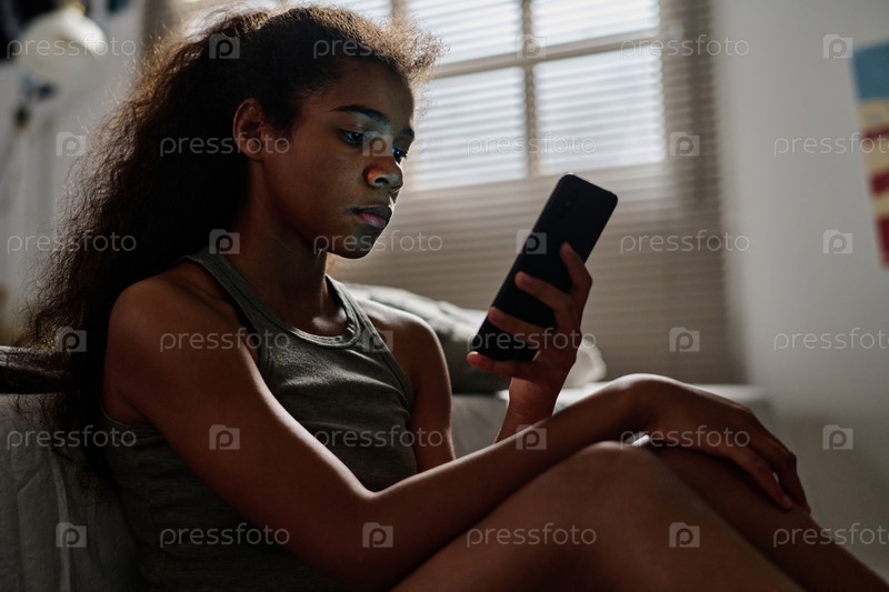 Боковой вид отчаянного подростка с мобильным телефоном, сидящего у кровати в своей комнате
