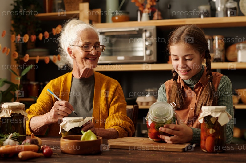 Счастливая старшая женщина смотрит на свою внучку, которая записывает имена огурцов