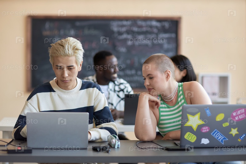 Молодая студентка смотрит на экран ноутбука своей одноклассницы на уроке