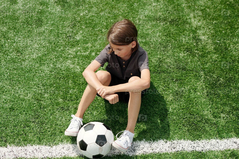 Сверху вид усталого школьника с футбольным мячом между ног, сидящего на газоне