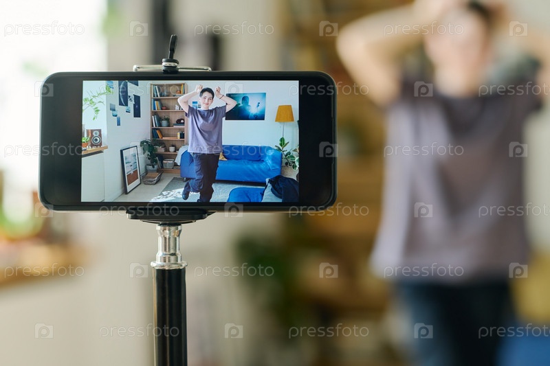 Сосредоточьтесь на смартфоне с танцующей девочкой-подростком в повседневной одежде на экране