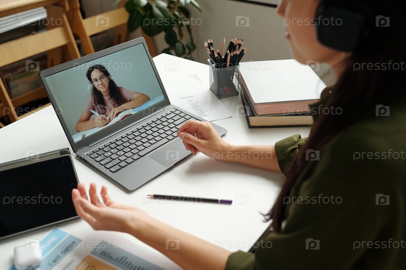 Сосредоточьтесь на экране ноутбука с умной школьницей во время онлайн-урока