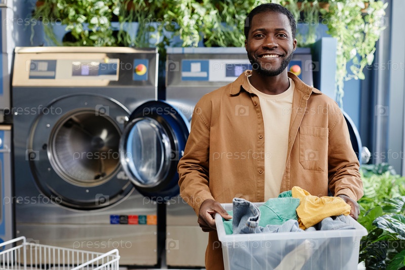 Счастливый молодой афроамериканец, держащий пластиковый контейнер с чистой одеждой