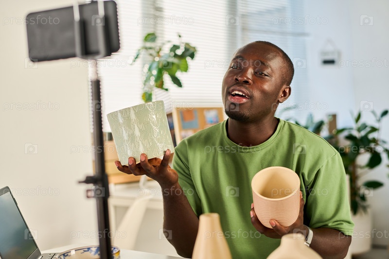 Молодой блоггер смотрит на камеру смартфона во время прямой трансляции
