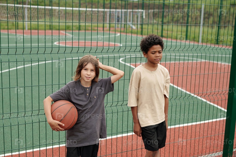 Два спокойных межкультурных мальчика в футболках, стоящих у зеленого металлического забора