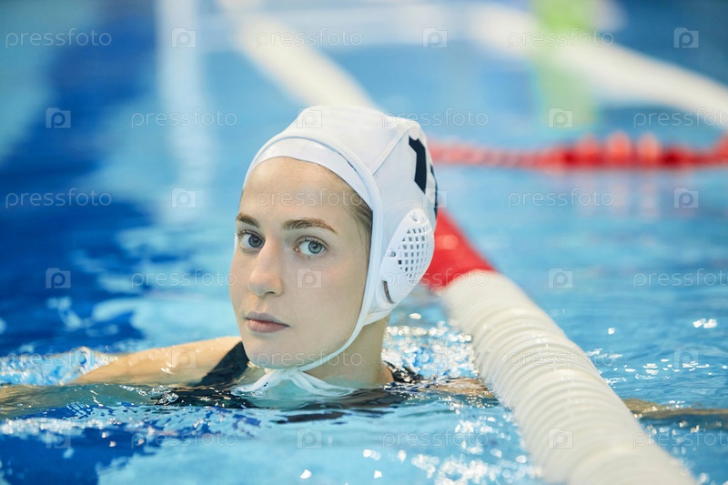 Молодая спортсменка в купальнике смотрит на камеру, стоя в воде