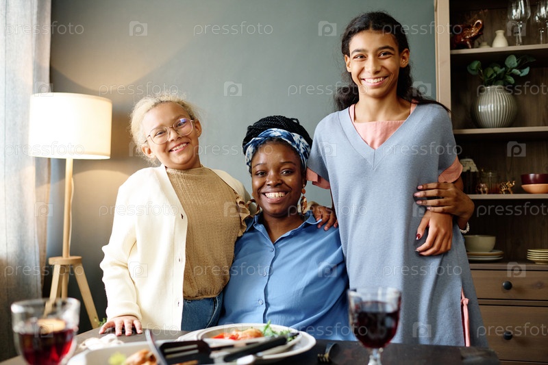 Две милые смеющиеся девочки, стоящие рядом со своей веселой матерью у праздничного стола