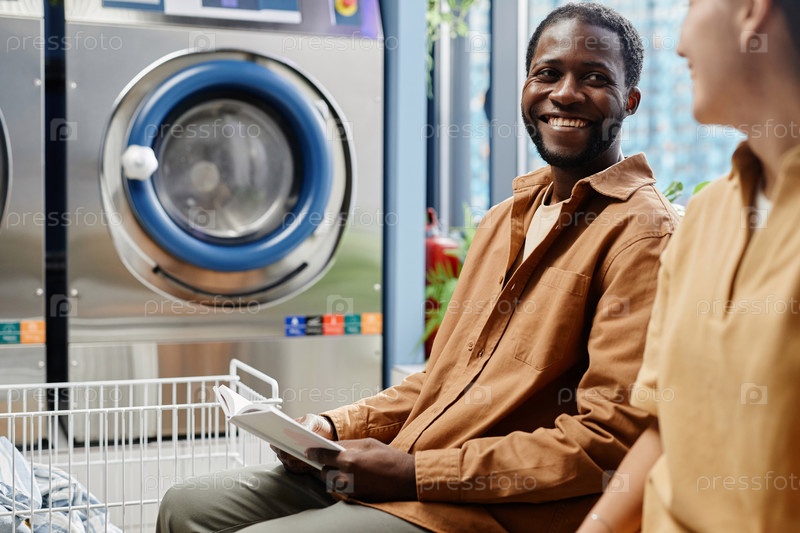 Счастливый молодой афроамериканский мужчина с открытой книгой смотрит на девушку в прачечной