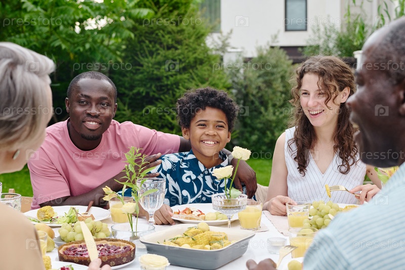 Счастливый афроамериканский мальчик, сидящий между своими межкультурными родителями