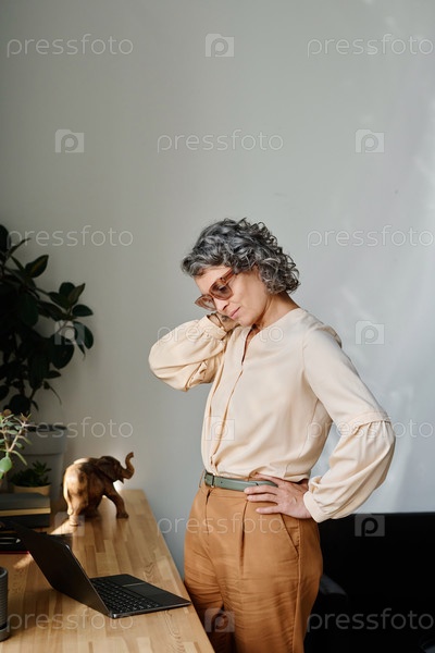 Опытная работодательница в тихом роскошном наряде смотрит на экран ноутбука