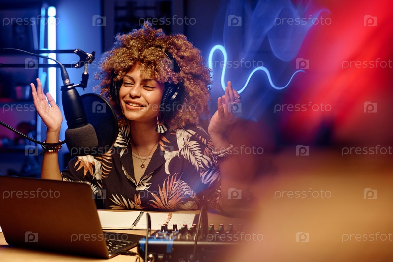 Счастливая ведущая в наушниках объясняет что-то онлайн аудитории