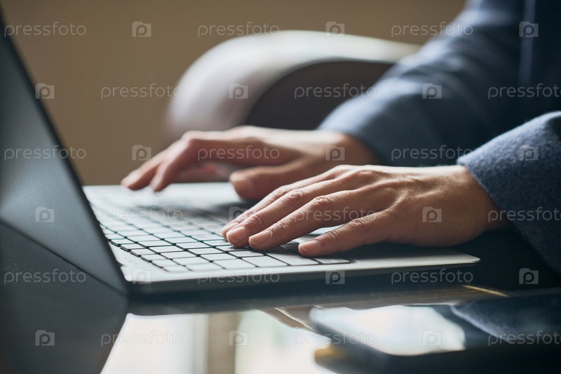 Деловая женщина печатает на ноутбуке и работает в Интернете