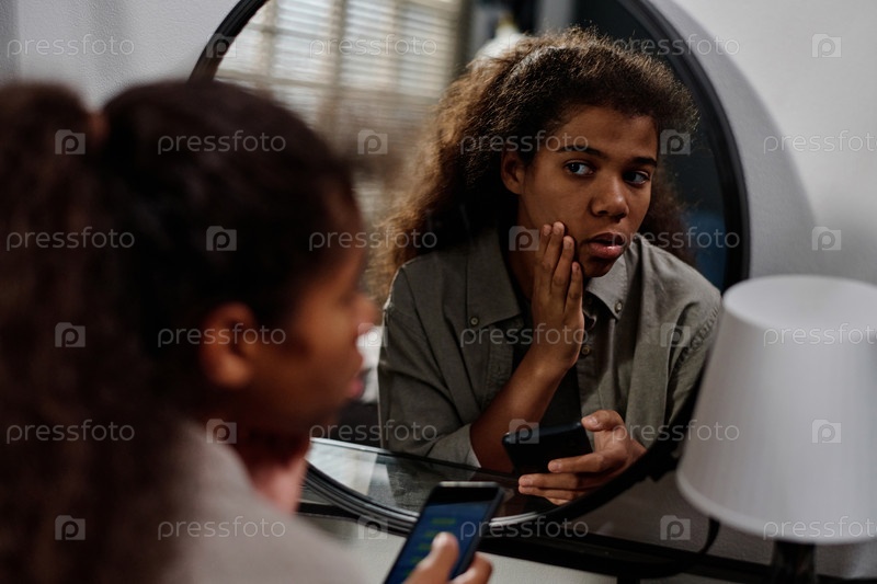 Стрессованная афроамериканская девушка прикасается к своему лицу и смотрит в зеркало