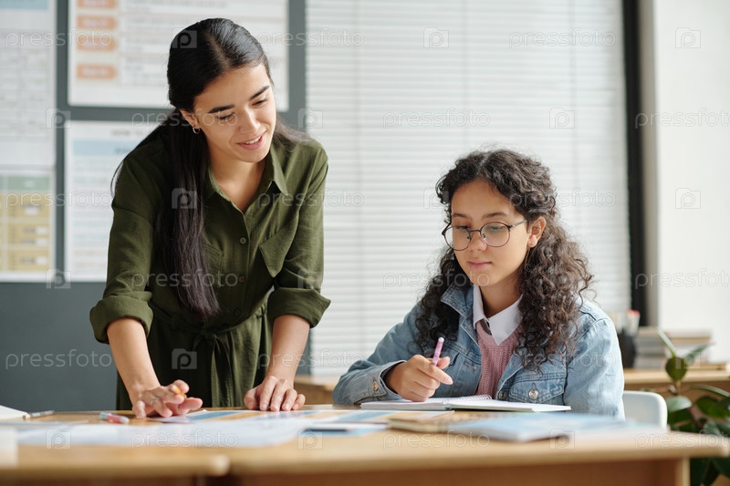 Счастливая молодая учительница английского языка наклоняется над столом с грамматическими таблицами