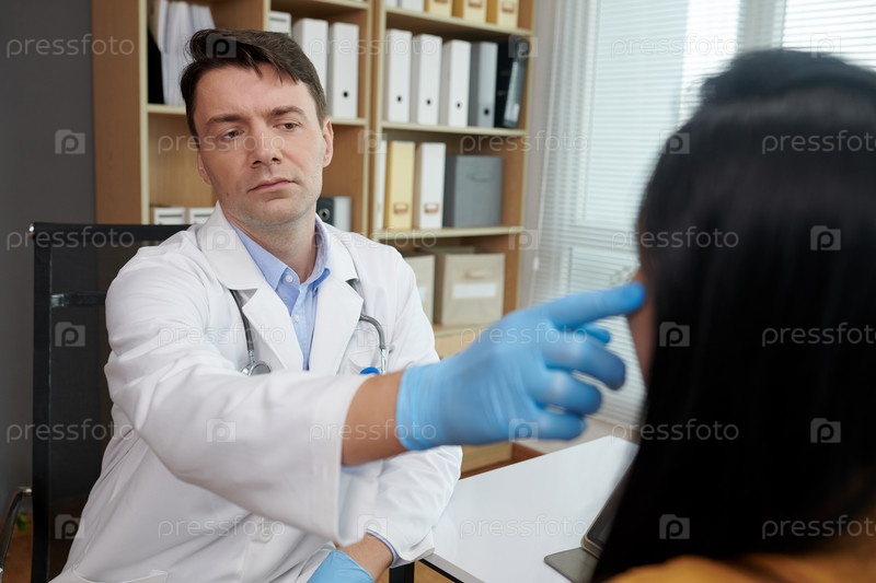 Пластический хирург прикасается к лицу пациента