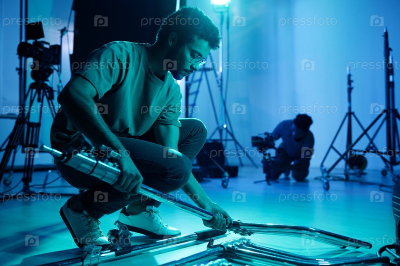 Оператор устанавливает оборудование для съемки