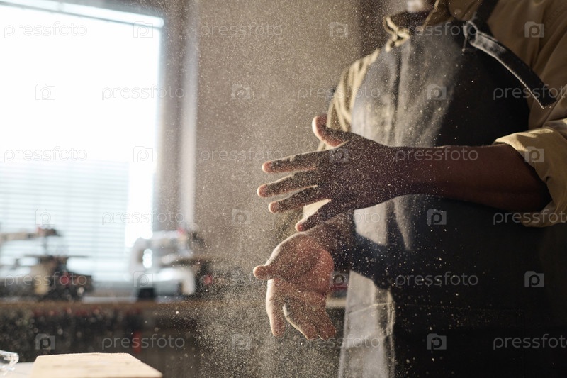 Черный плотник чистит пиломатериалы с рук с облаком в воздухе