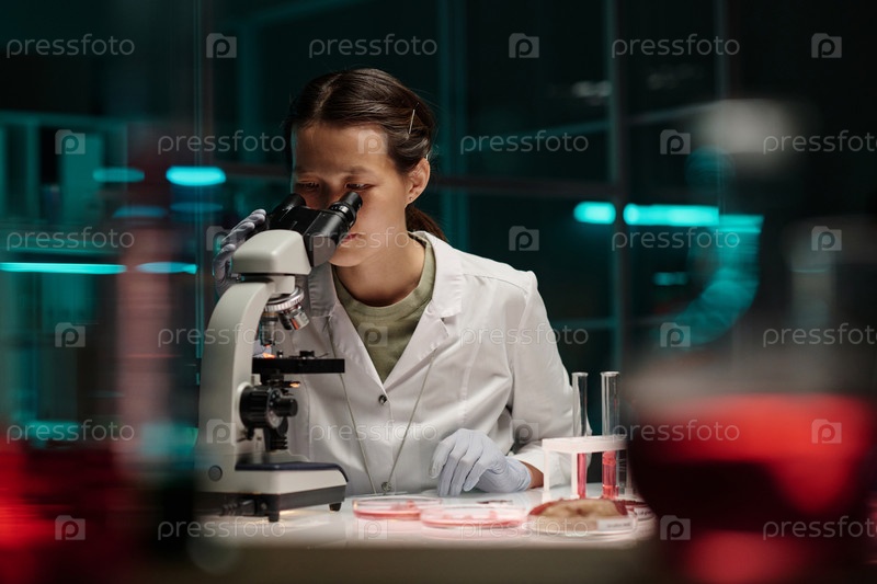 Молодая женщина-ученый, работающая с микроскопом в лаборатории