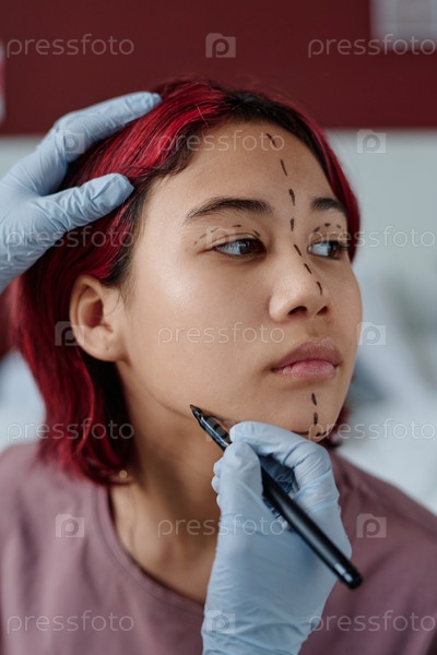 Девушка-подросток с окрашенными фиолетовыми волосами, лицо которой готовится к операции