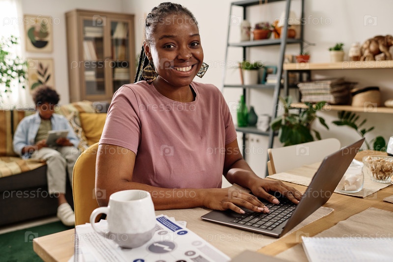 Чернокожая женщина работает на ноутбуке дома
