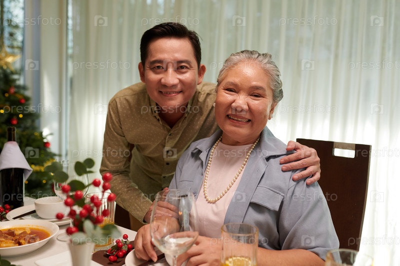 Мужчина позирует с матерью за обеденным столом
