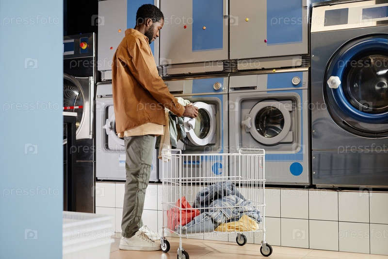Афроамериканский парень кладет сложенную одежду в автоматическую стиральную машину