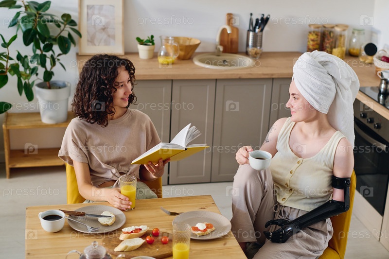 Молодая улыбающаяся женщина с открытой книгой смотрит на девушку-инвалида